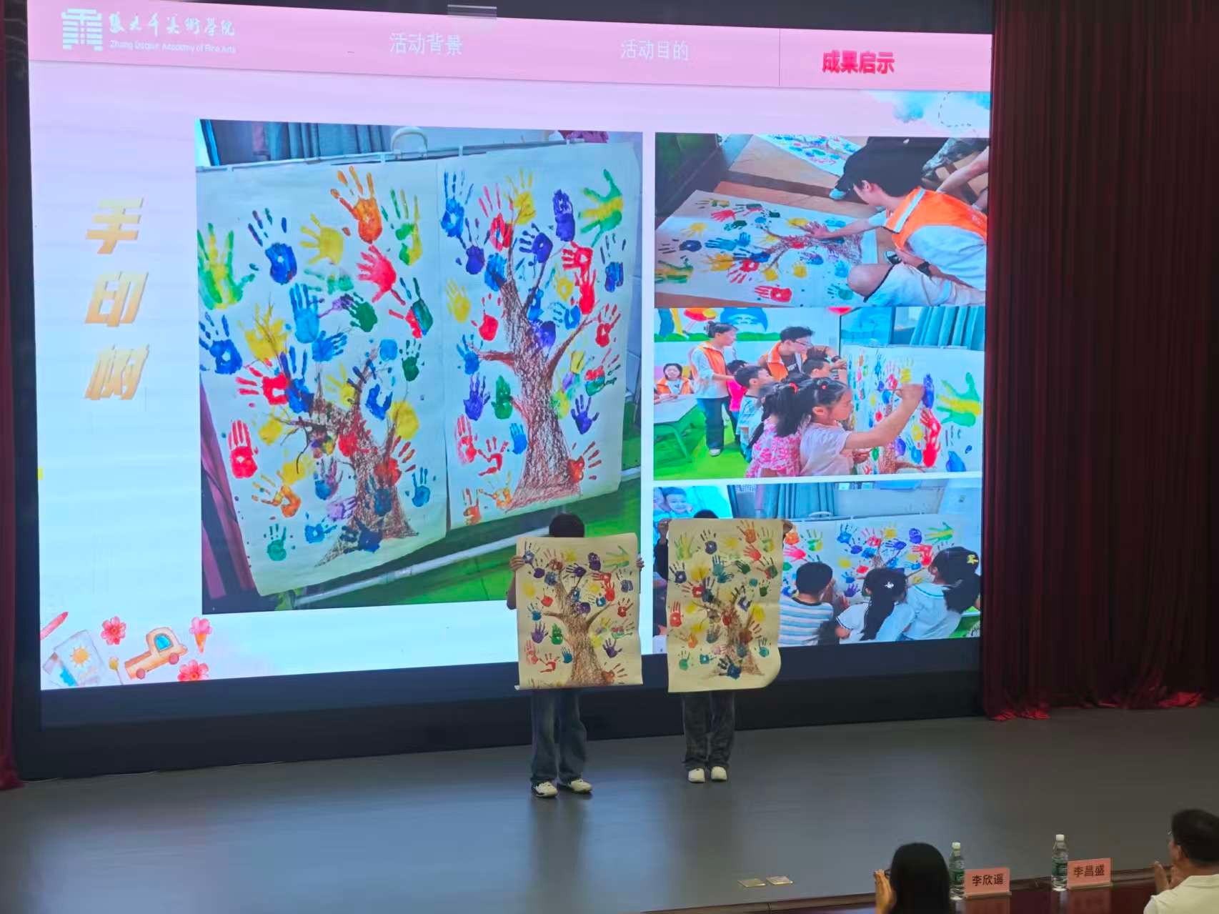 在成果展示环节,“艺润童心绽华彩,情牵稚梦共成长”大千行志愿者服务队代表刘益妹分享了团队在内江市东兴区高晟幼儿园开展的艺术启蒙实践。通过为期五天的主题式美育课程,志愿者们充分发挥美术专业特长,为孩子们带去了丰富多彩的艺术体验。