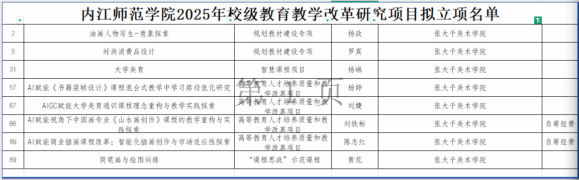 近日,内江师范学院教务处公示2025年度教育教学改革研究项目拟立项名单,张大千美术学院共有8项课题入选,涉及规划教材建设、智慧课程建设、高等教育教学改革等多个类别。