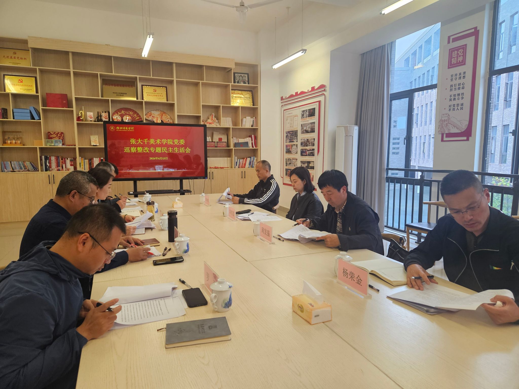 为深入贯彻落实学校第四届党委第三轮巡察反馈意见,扎实推进巡察整改各项工作落地见效,4月13日下午,张大千美术学院党委召开巡察整改专题民主生活会。省纪委监委驻校纪检监察组组长、学校党委副书记、纪委书记冯雪莲、校工会常务副主席、第二巡察组组长周发强、组织部正处级组织员商林威、纪检监察室副主任杨荣金到会指导,学院党委书记李欣遥、院长杨坤等班子成员参加会议,会议由李欣遥主持。