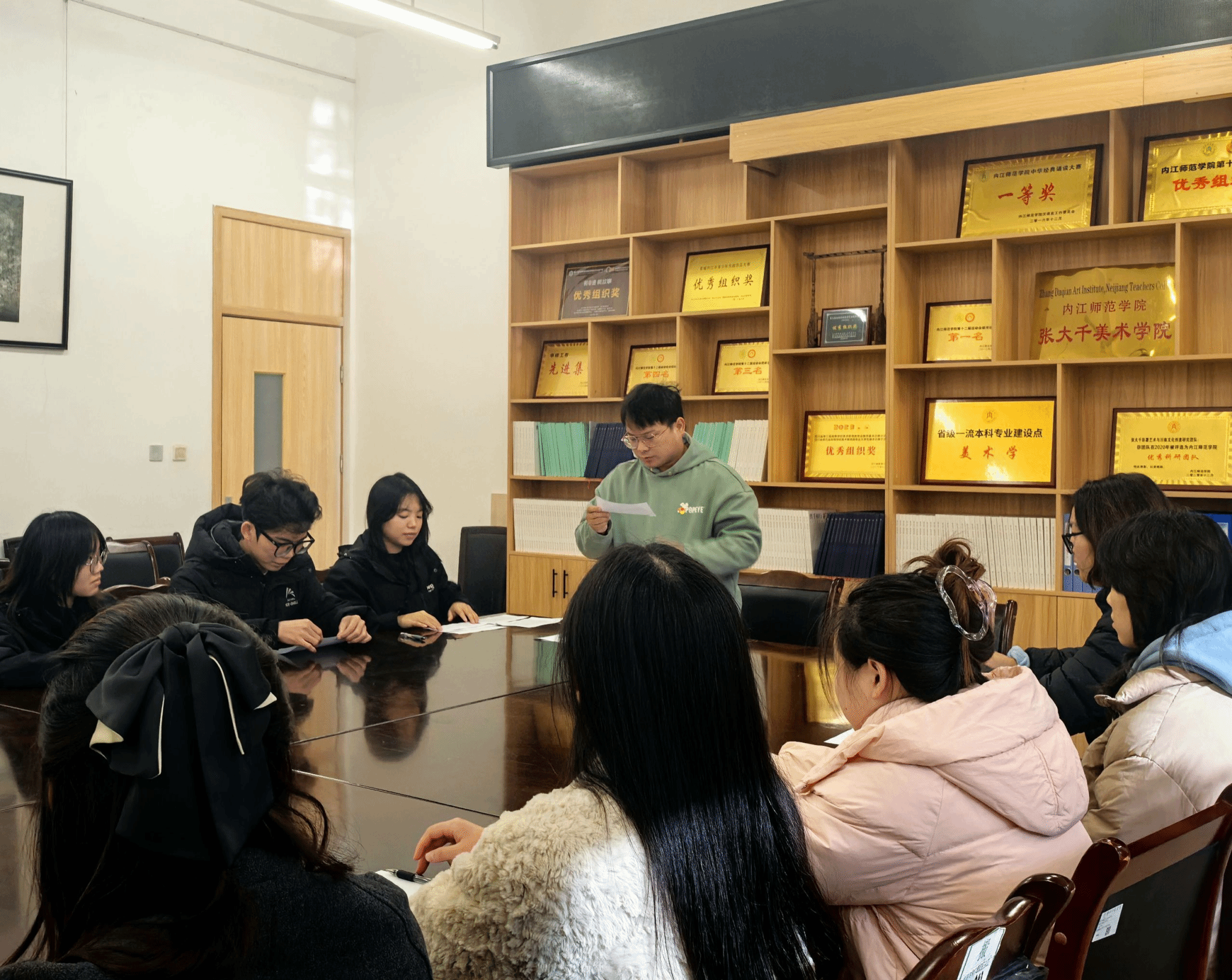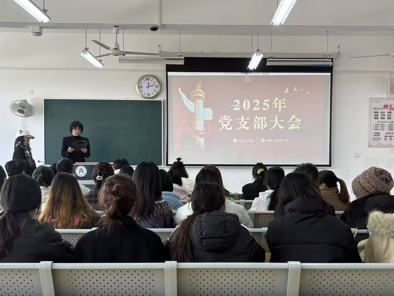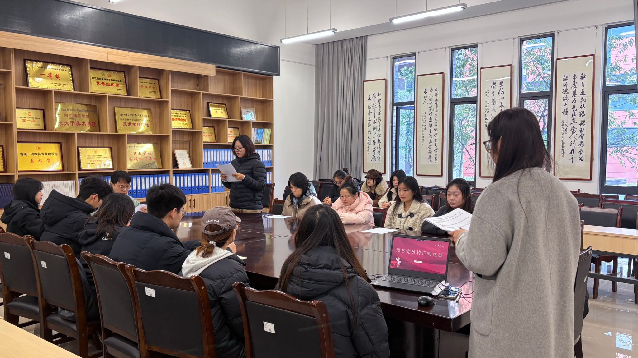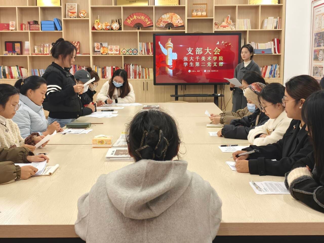 2025年11月22日,张大千美术学院各学生党支部召开大会,审议并表决了7名预备党员的转正申请。其中,学生第一党支部书记李昌盛在大千楼A109教室主持会议,学生第二党支部书记杨静在大千楼A216教室主持会议,学生第三党支部书记李铃在明德楼A323教室主持会议。各支部全体党员参加了所在支部的会议。