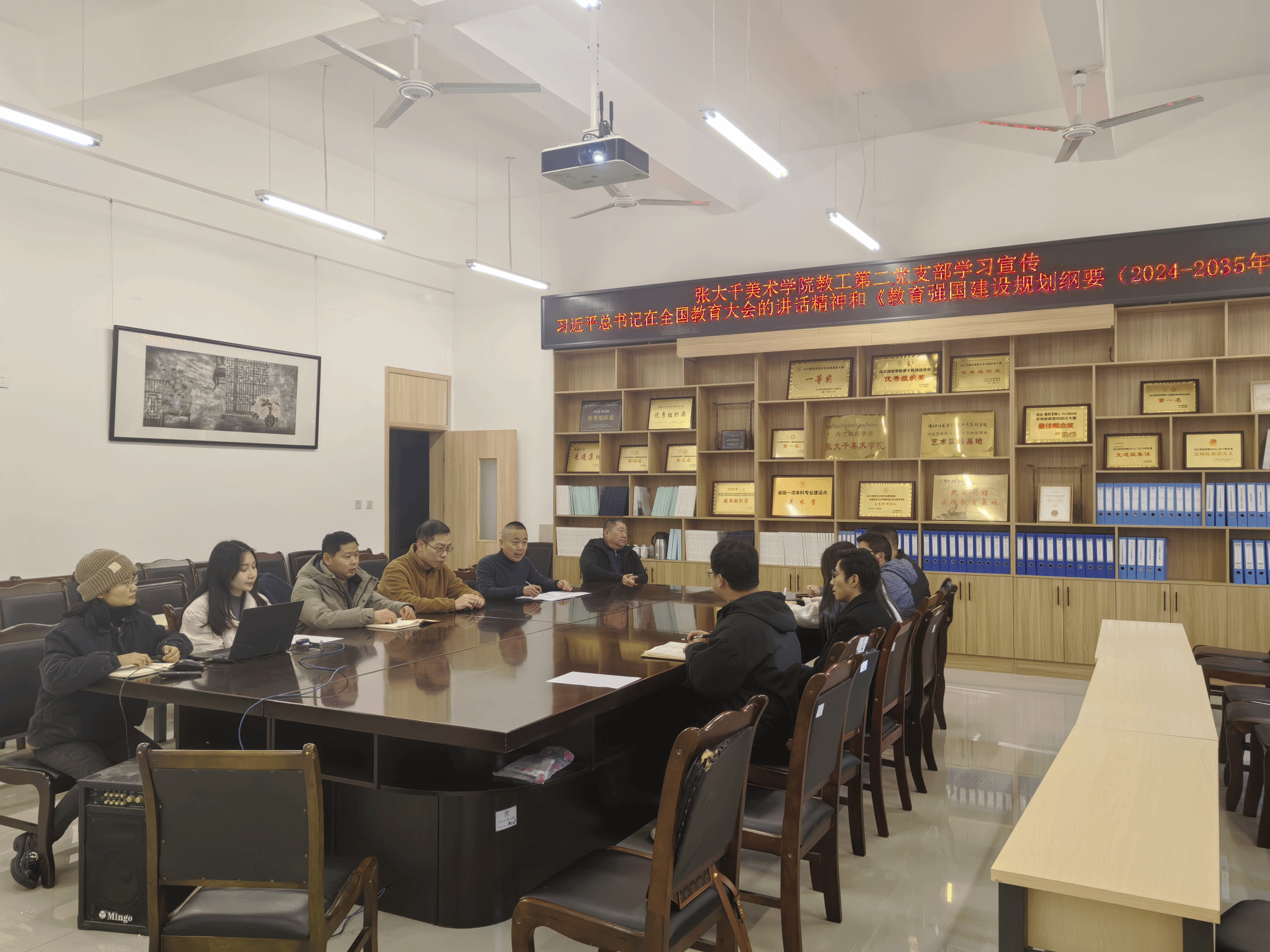 为深入学习贯彻习近平总书记关于教育的重要论述,切实把思想和行动统一到教育强国建设部署上来,10 月 30 日上午,张大千美术学院教工第二党支部在大千楼 A109 会议室召开专题学习会,集中学习习近平总书记在全国教育大会上的讲话精神和《教育强国建设规划纲要(2024—2035 年)》,支部全体 14 名党员参会,会议由支部书记杨政主持。