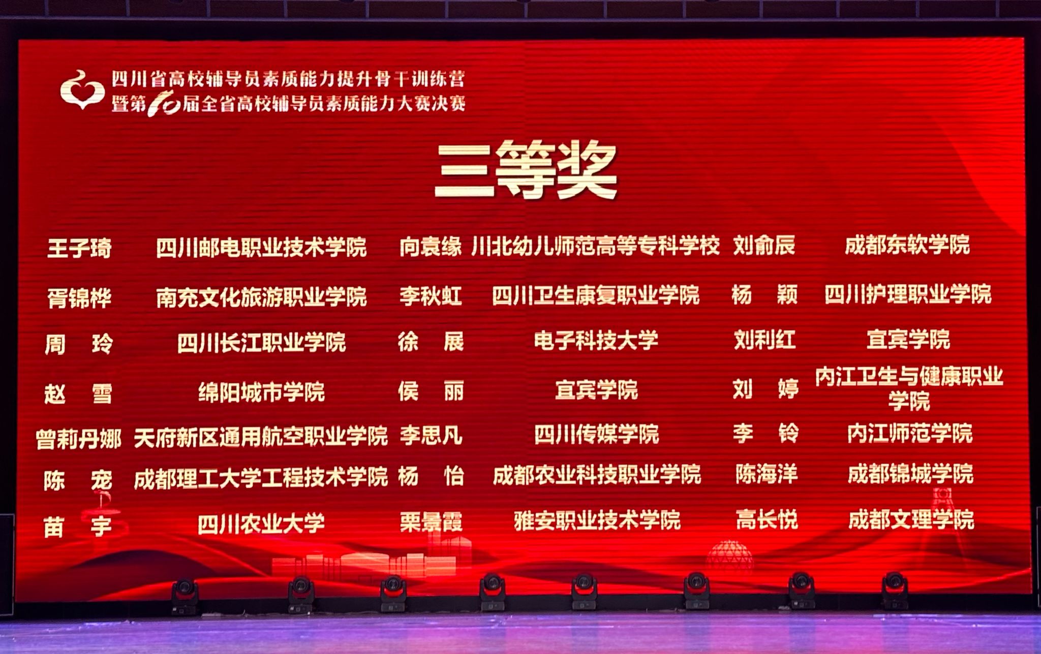 11月14日至16日,四川省高校辅导员素质能力提升骨干训练营暨第10届全省高校辅导员素质能力大赛决赛在四川西华大学举行。来自全省各高校的166名辅导员参训参赛。经过激烈的角逐,我院辅导员李铃老师荣获三等奖。