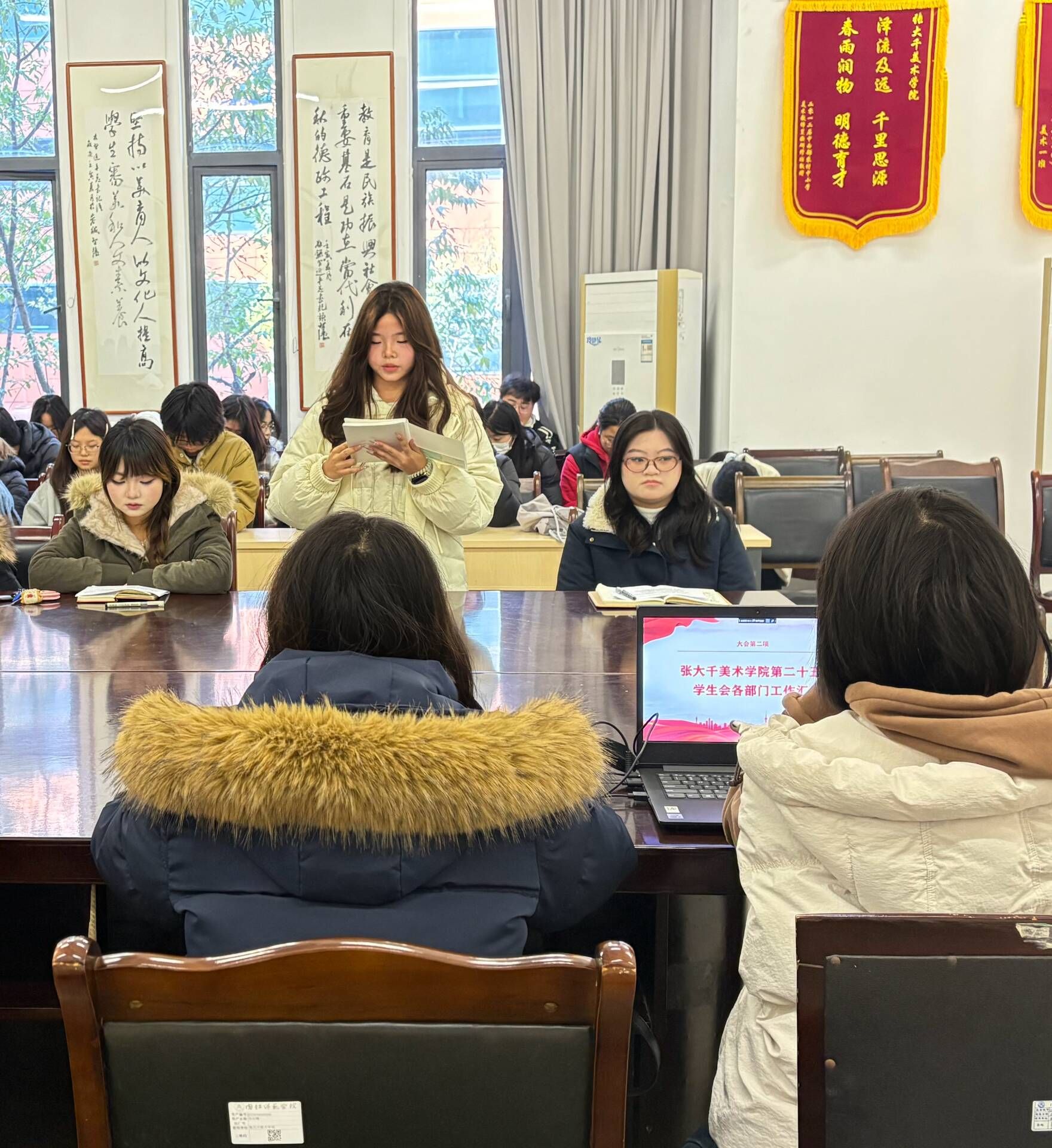 为高效推进学期重点工作,扎实做好迎新晚会筹备工作,进一步强化学生会各部门的组织联动,11月28日,我院于大千楼A109教室召开张大千美术学院第二十五届学生会2025-2026学年第一学期第二次工作例会。学工办王广旭老师、李昌盛老师、学生会全体成员及各班级班长共同参会。会议由学生会执行主席邬珂同学主持。